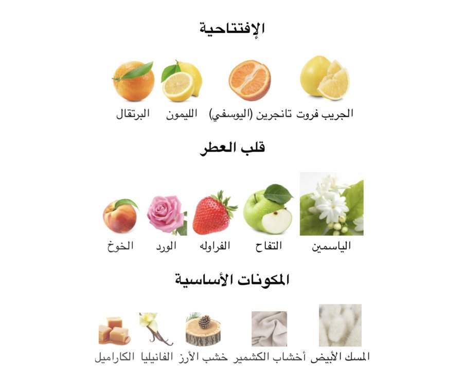 • القاعدة: المسك الأبيض 🤍، الكاشميران 🌿، الأرز 🌳، الفانيليا 🍦، الكراميل 🍮