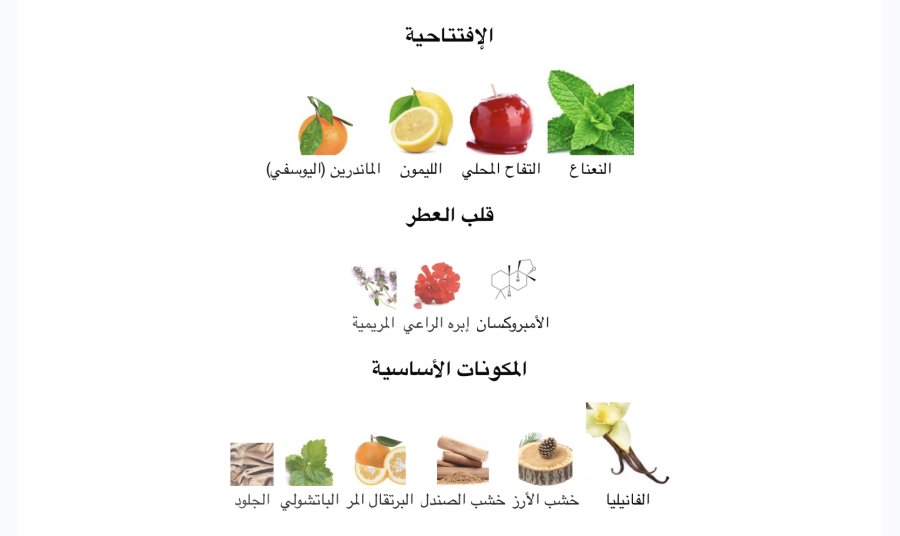 • القاعدة: الفانيليا 🍦، الأرز 🌳، خشب الصندل 🌾، البرتقال المر 🍊، الباتشولي 🌿 والجلد 🤎