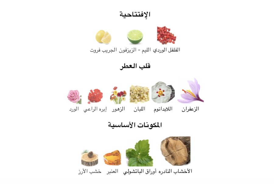 • القاعدة: الأخشاب الثمينة 🌲، أوراق الباتشولي 🍃، العنبر ✨، الأرز 🌳