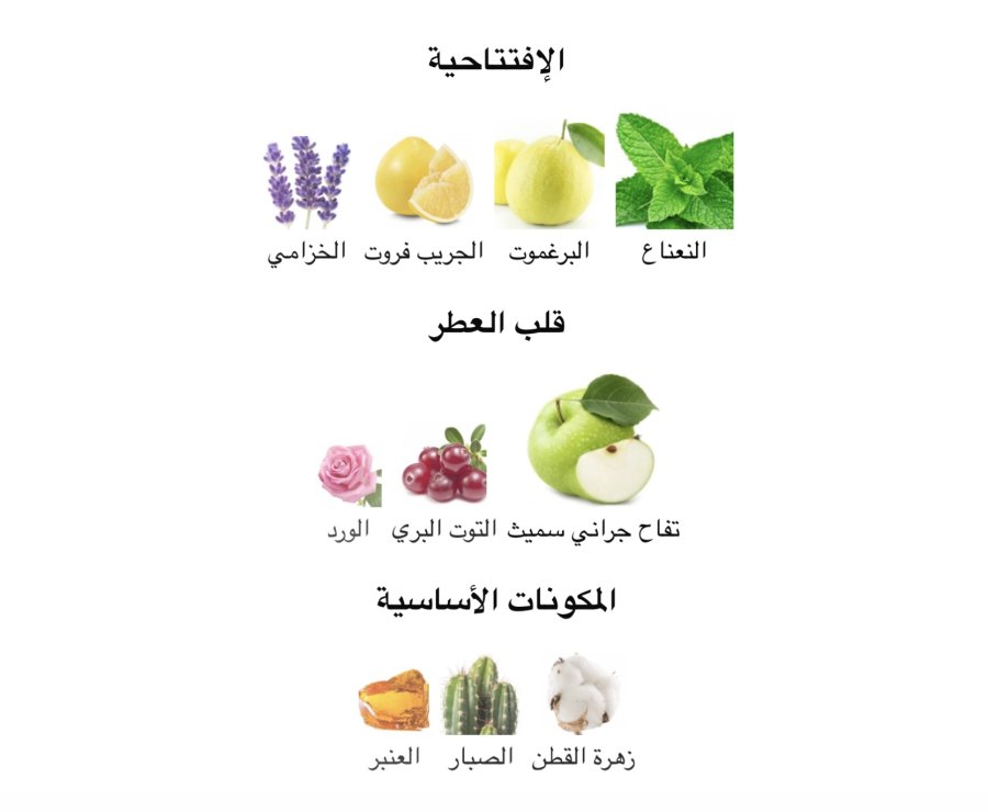 •المقدمة: النعناع 🌿، البرغموت 🍋، الجريب فروت 🍊، اللافندر 💜