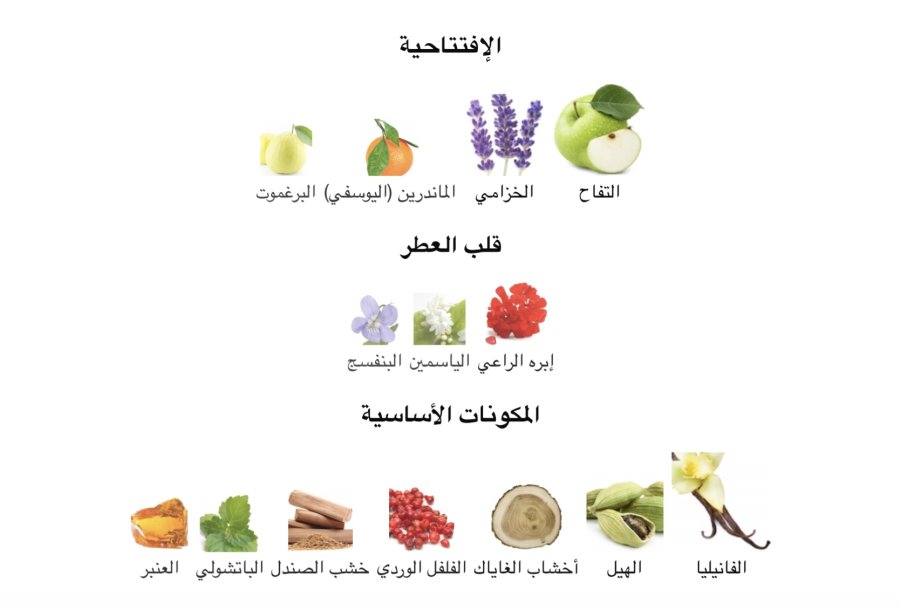 - القاعدة: الفانيليا 🌼، الهيل 🌿، خشب الغاياك 🌳، الفلفل الوردي 🌶️، خشب الصندل 🌲، الباتشولي 🍂، العنبر ✨