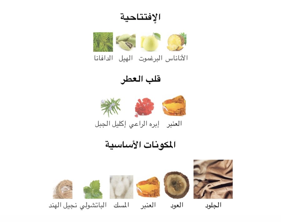 • القاعدة: الجلد 🖤، العود 🌳، العنبر 🧡، المسك 🤍، الباتشولي 🌿، نجيل الهند 🌱