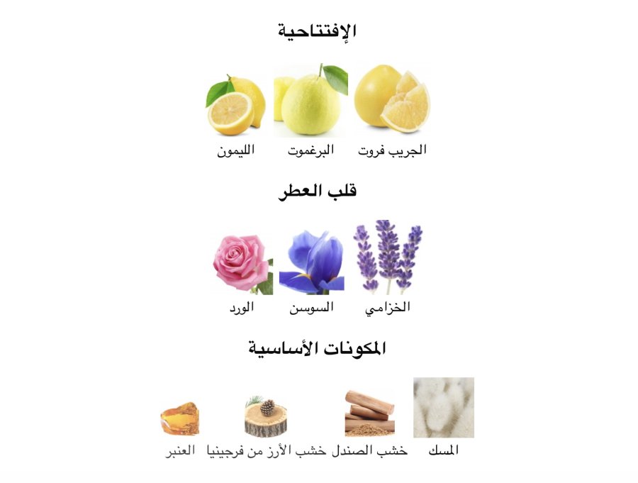 •القاعدة: المسك 🐚، خشب الصندل 🌳، خشب الأرز من فرجينيا 🌲، العنبر 🌞
