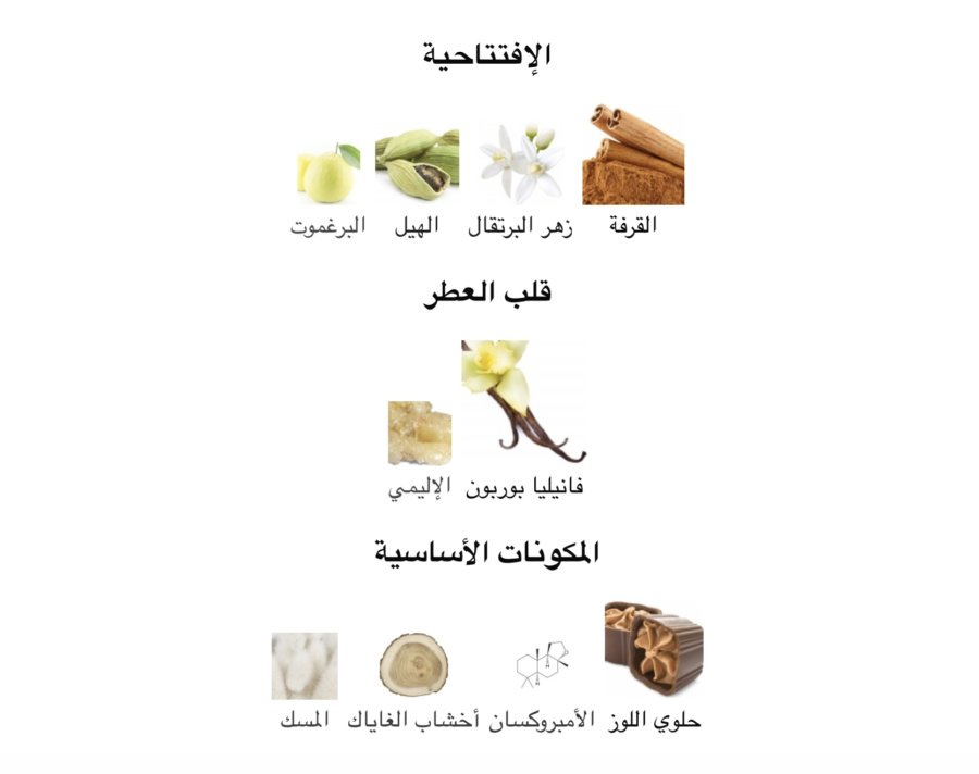 - القاعدة: برالين 🍫، أمبروكسان 💎، خشب الغاياك 🪵، المسك 🤍