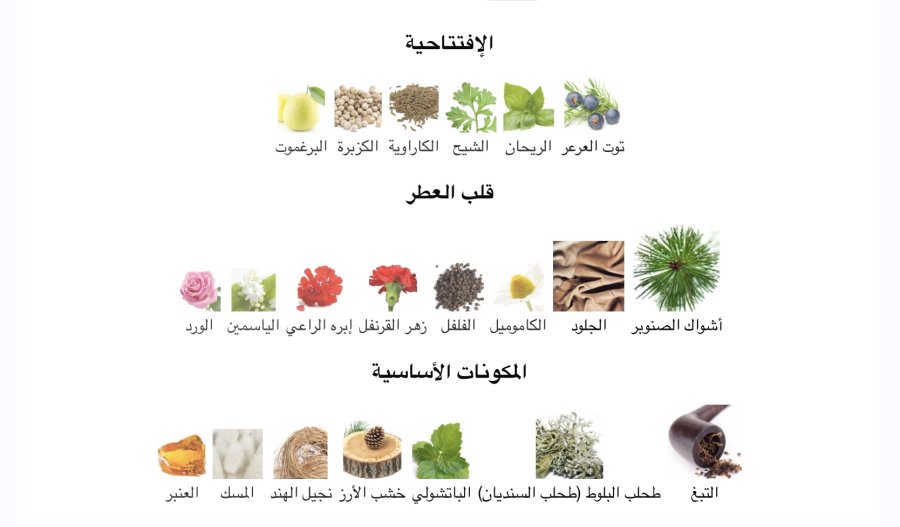 •القلب: إبر الصنوبر 🌲، الجلد 🖤، البابونج 🌼، الفلفل 🌶️، القرنفل 🌺، إبرة الراعي 🌸، الياسمين 🌼، الورد 🌹