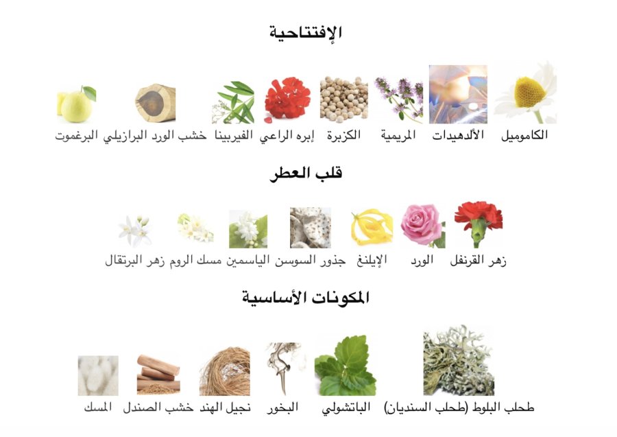 - القلب: القرنفل 💐، الورد 🌹، الإيلنغ يلانغ 🌺، جذور السوسن 🌱، الياسمين 🤍، مسك الروم 🌼، زهرة البرتقال 🍊