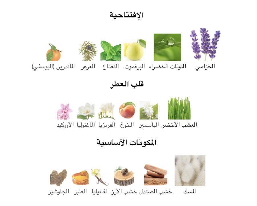 - المقدمة: اللافندر 💜، نوتات خضراء 🌿، البرغموت 🍋، النعناع 🌱، العرعر 🌲، اليوسفي 🍊