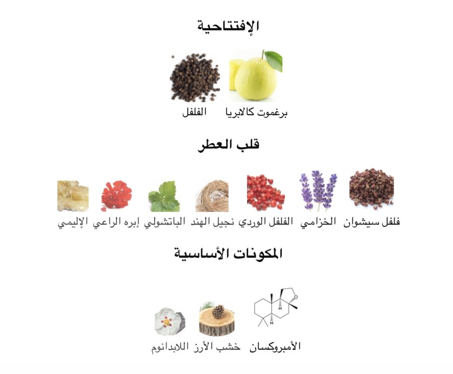 - القلب: فلفل سيشوان 🌶️، اللافندر 💜، الفلفل الوردي 🌸، نجيل الهند 🌾، الباتشولي 🌿، إبرة الراعي 🌺، راتنج الإليمي 💧