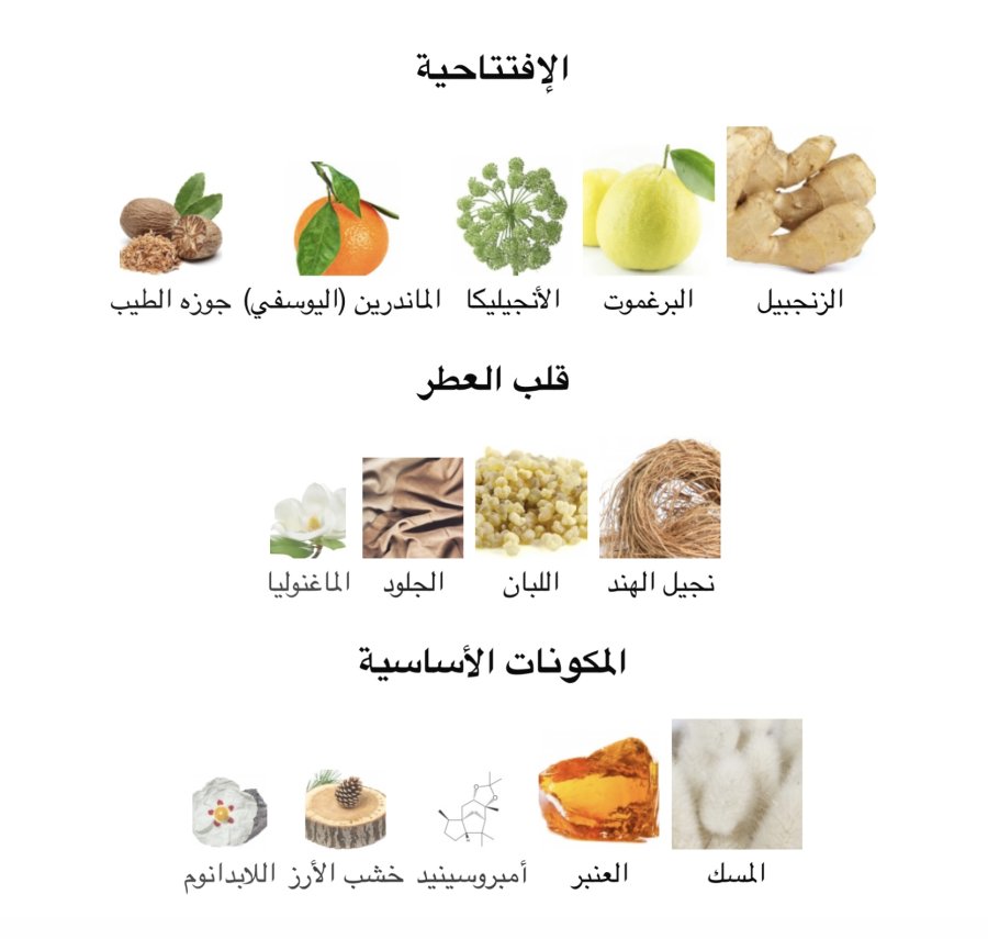 - القاعدة: المسك 🤍، العنبر ✨، خشب الأرز 🪵، أمبروكسانيد 🧪، اللابدانيوم 🌿