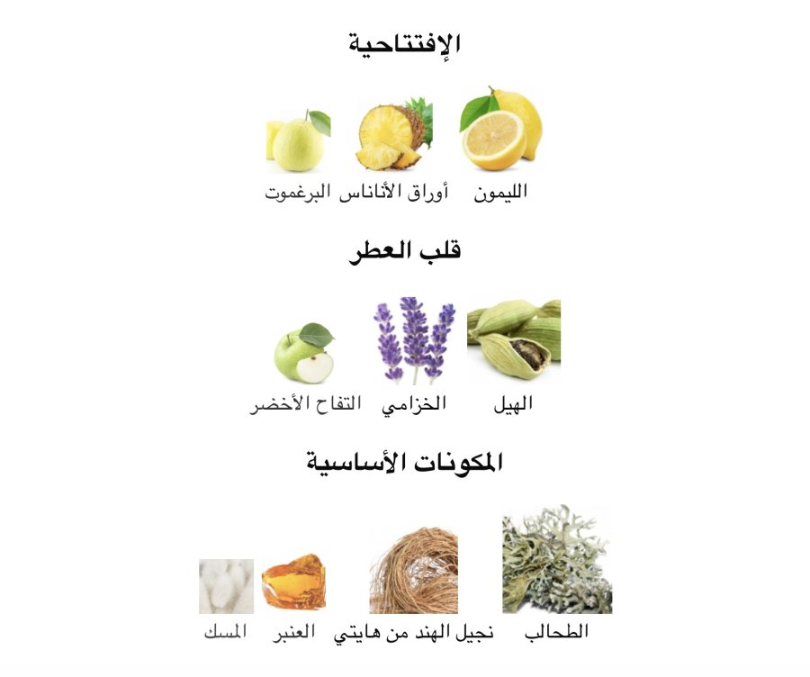 • القلب: الهيل 🌿، اللافندر 💜، التفاح الأخضر 🍏