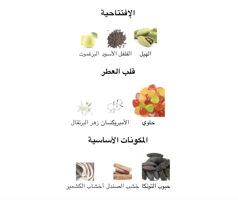 •القاعدة: حبوب التونكا 🌰، خشب الصندل 🌳، خشب الكشمير 🪵