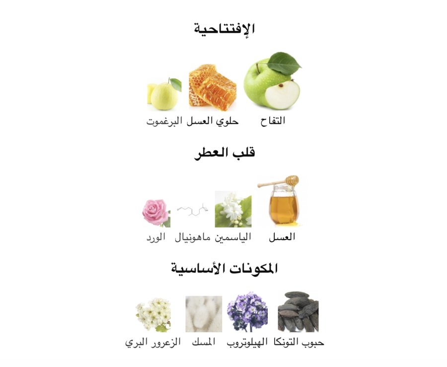 •القلب: العسل 🍯، الياسمين 🤍، الماهونيال 🌿، الورد 🌹