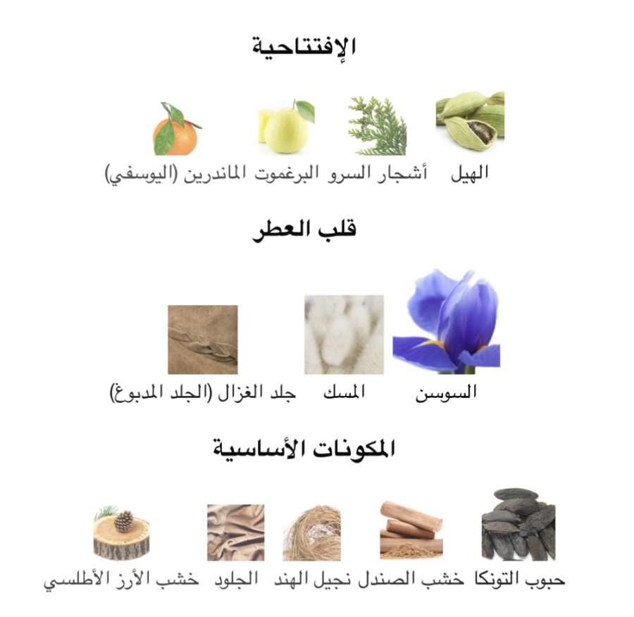 • القاعدة: التونكا 🍮، خشب الصندل 🌿، نجيل الهند 🌱، الجلد 🖤، الأرز الأطلسي 🌳