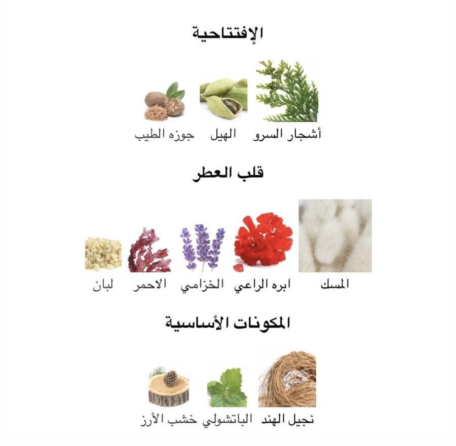 • القلب: المسك 🤍، الغرنوقي البوربوني 🌺، اللافندر 💜، الطحالب الحمراء 🌊، البخور 🔥