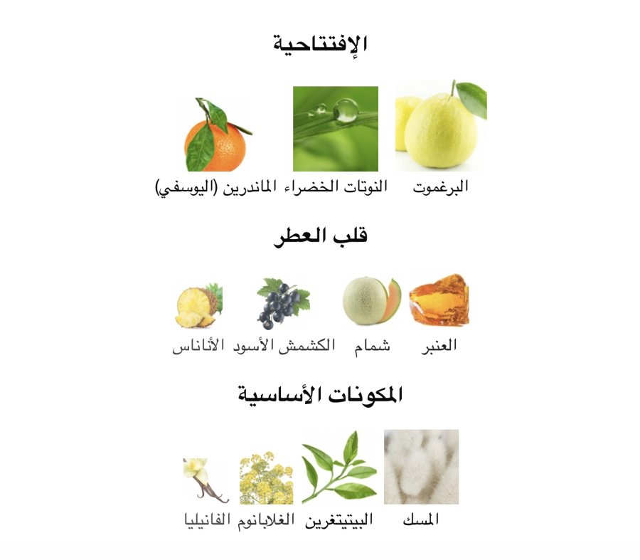 • المقدمة: البرغموت 🍋، النوتات الخضراء 🍃، المندرين 🍊