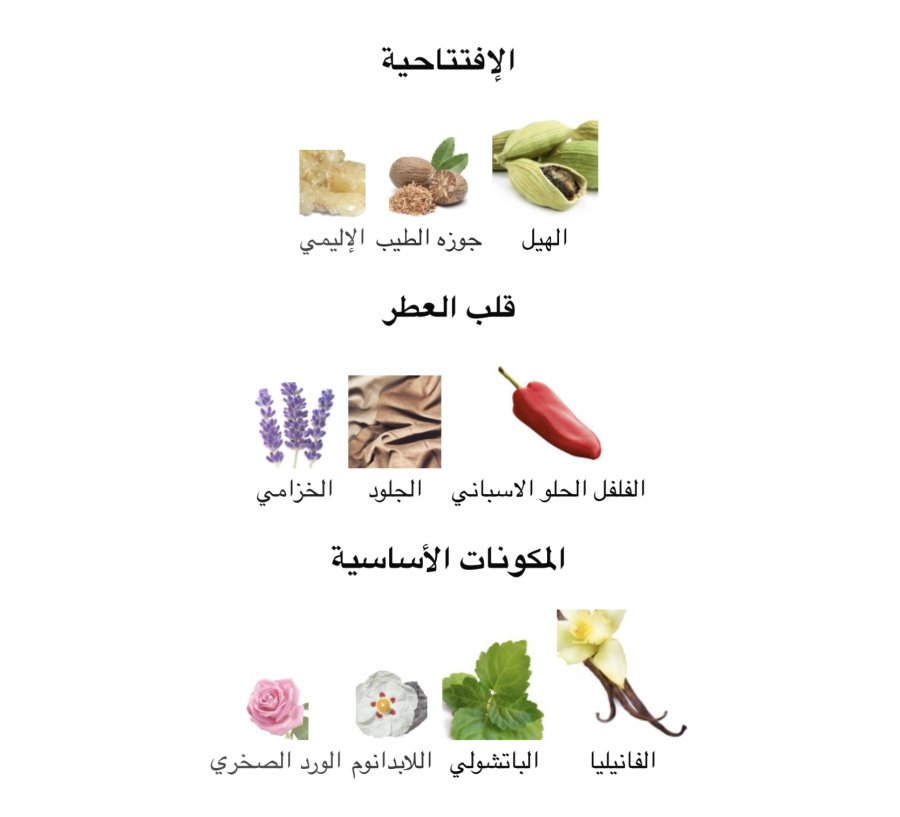 • القاعدة: الفانيلا 🍦، الباتشولي 🌱، اللابدانوم 🌿، وصخر الوردة 🌹
