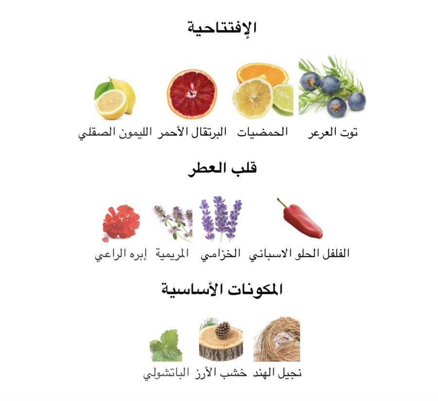• القاعدة: نجيل الهند 🌱، الأرز 🌳، الباتشولي 🌿