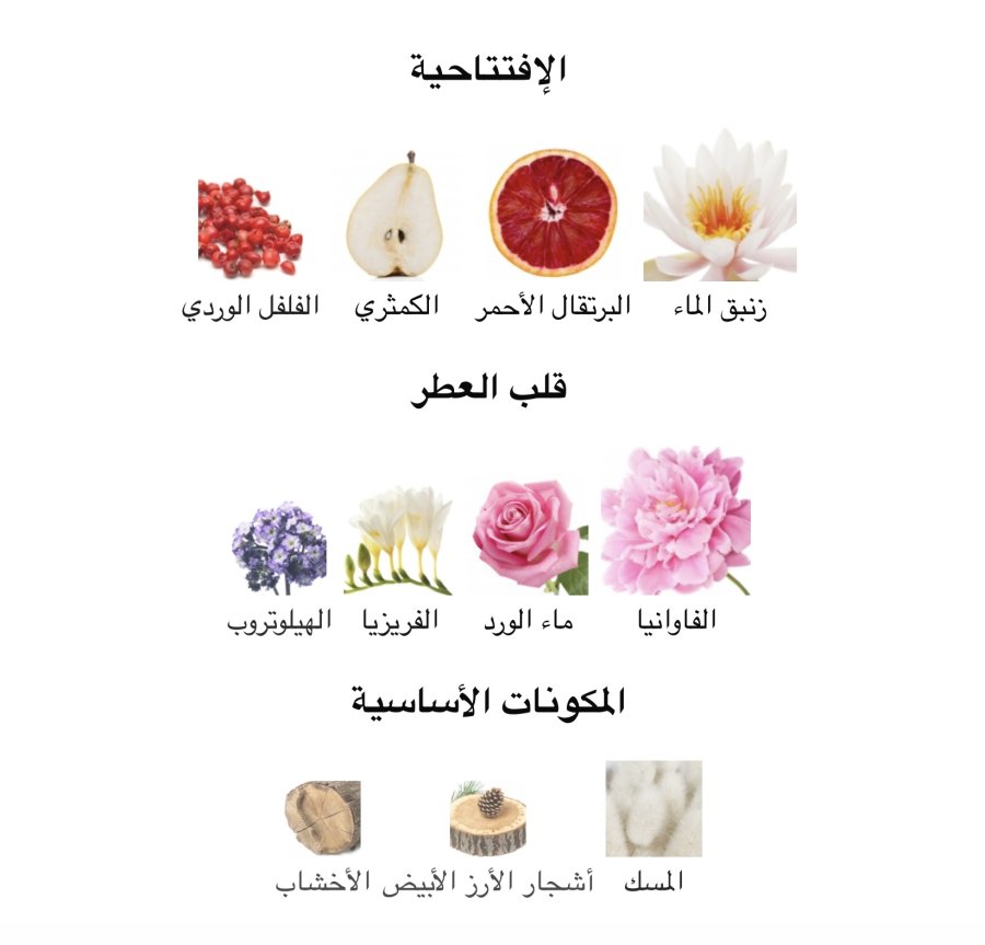 • القاعدة: المسك 🤍، خلاصة الأرز الأبيض 🌳، والنوتات الخشبية 🌾