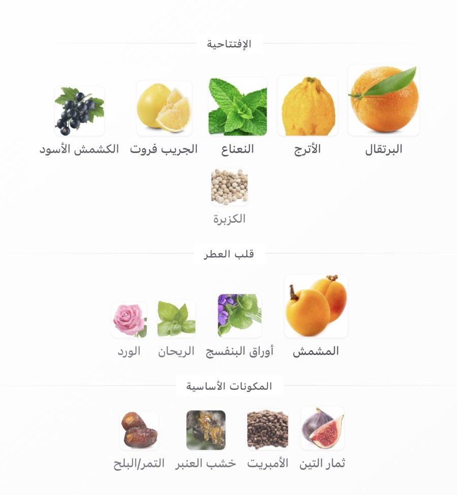 • القاعدة: التين، الأمبريت، عنبر الخشب، التمر 🌴