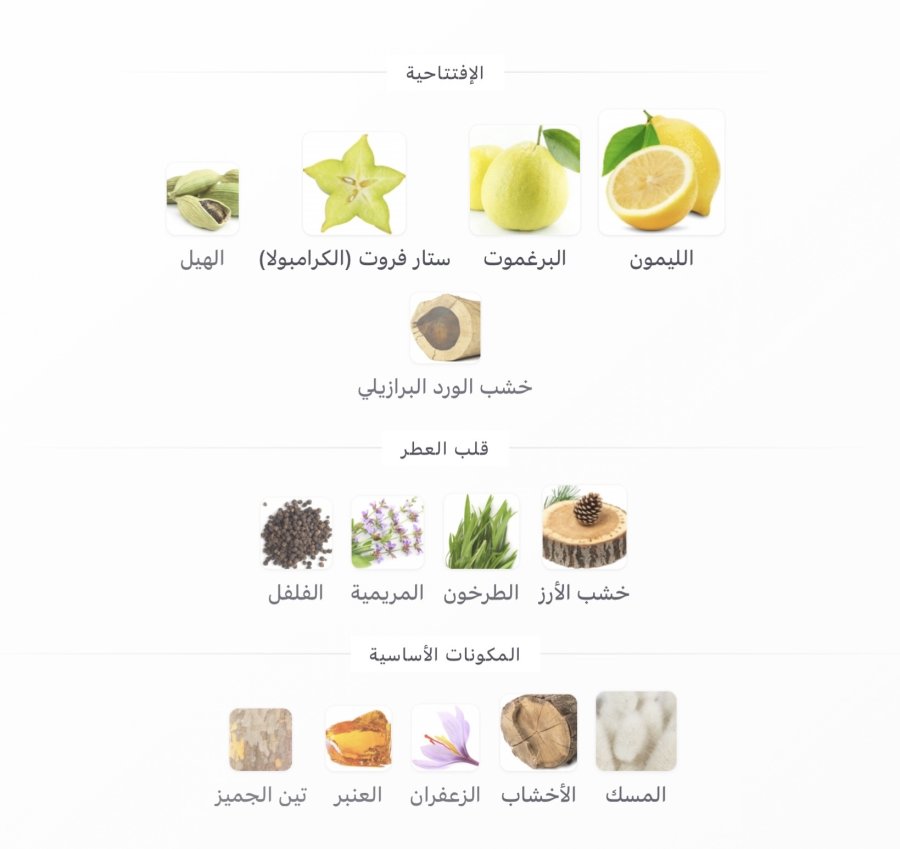 • المقدمة: الليمون 🍋، البرغموت 🍊، فاكهة النجمة (كارامبولا) 🌟، الهيل 🌱، خشب الورد البرازيلي 🌳
