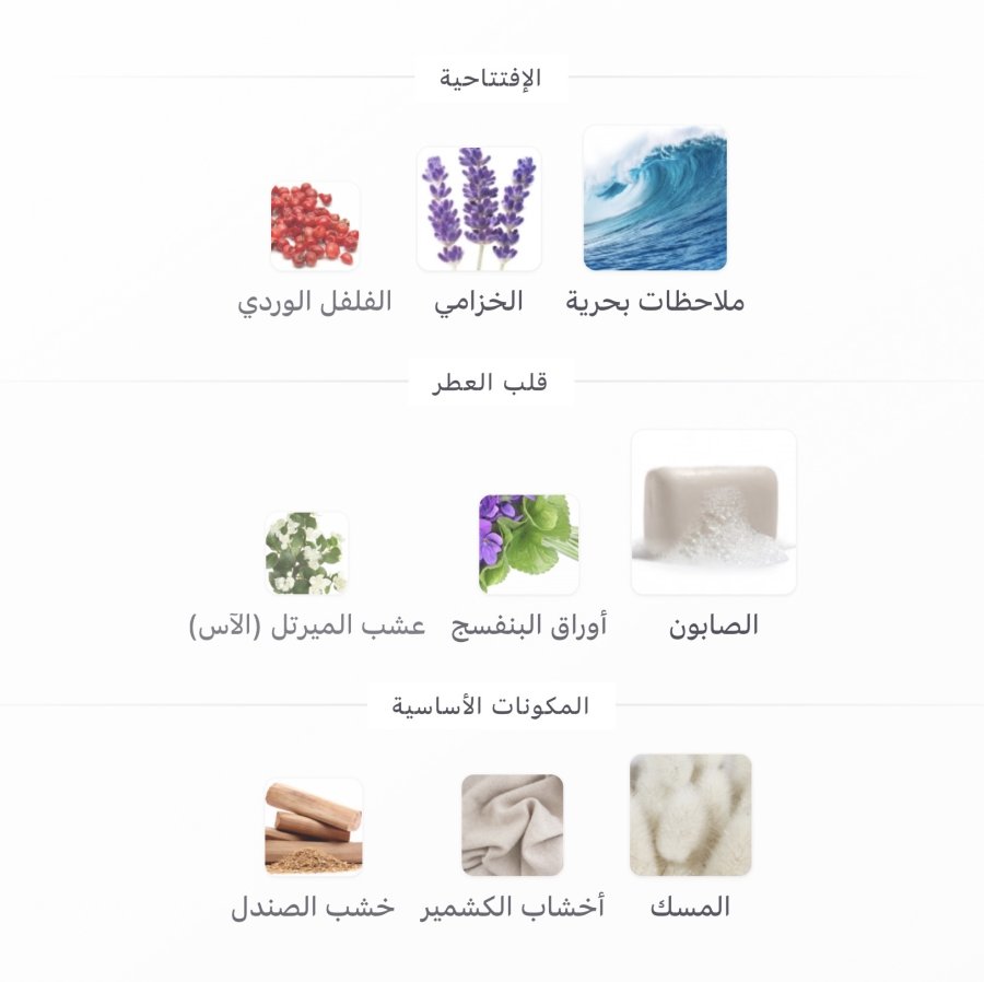 • القاعدة: المسك 🤍، الكشميران 🌬️، خشب الصندل 🌲