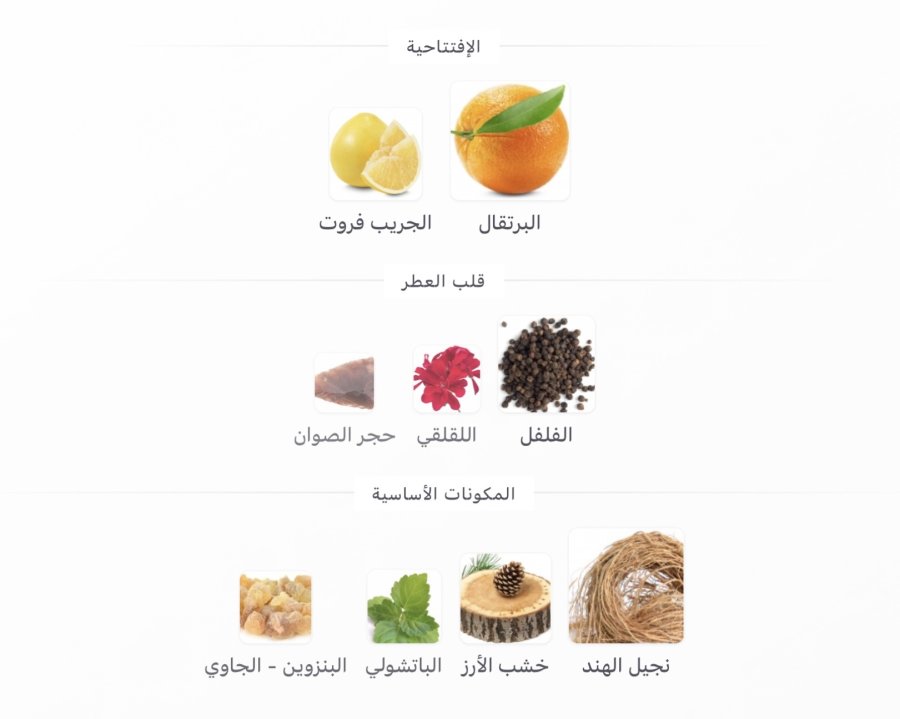 • القاعدة: نجيل الهند 🌱، خشب الأرز 🌲، الباتشولي 🌿، البنزوين 🧡