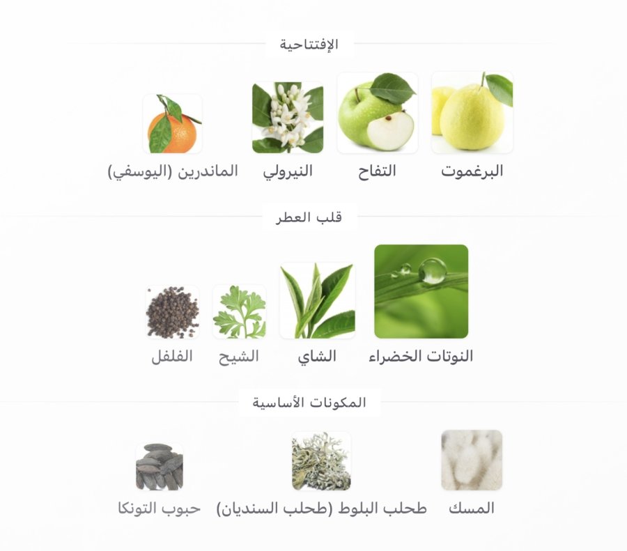 • القلب: النوتات الخضراء 🌿، الشاي 🍃، الأرتيميسيا 🌱، الفلفل الأسود 🌶️