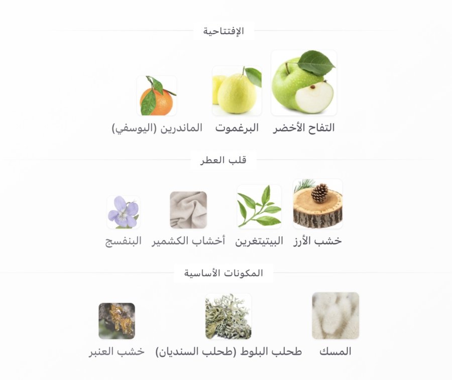 • القاعدة: المسك 🤍، طحلب السنديان 🌿، خشب العنبر 🪵