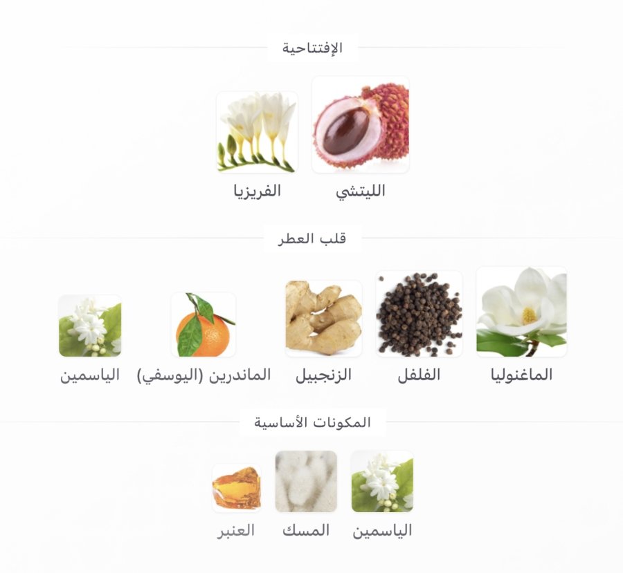 • القلب: الماغنوليا 🌼، الفلفل 🌶️، الزنجبيل 🫚، المندرين 🍊، الياسمين 🌼