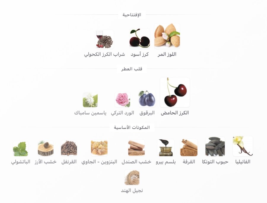 • القاعدة: الفانيليا 🍮، حبوب التونكا 🌰، القرفة 🌶️، بلسم بيرو 🧴، خشب الصندل 🌳، البنزوين 💎، القرنفل 🌸، الأرز 🌲، الباتشولي 🌿، نجيل الهند 🌱