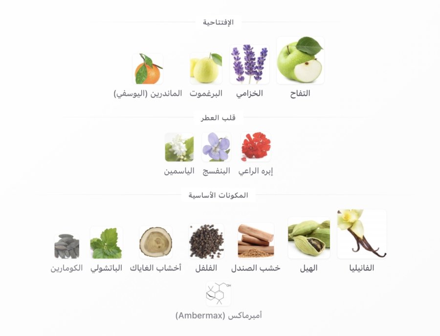 • القاعدة: الفانيليا 🍮، الهيل 🌰، خشب الصندل 🌳، الفلفل 🌶️، خشب الغاياك 🌲، الباتشولي 🌿، الكومارين 🌾، أمبرماكس™ ✨