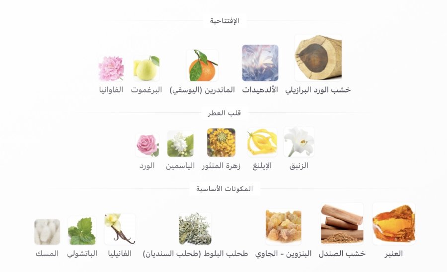 • المقدمة: خشب الورد البرازيلي 🌹، الألدهيدات ✨، اليوسفي 🍊، البرغموت 🍋، الفاوانيا 🌸