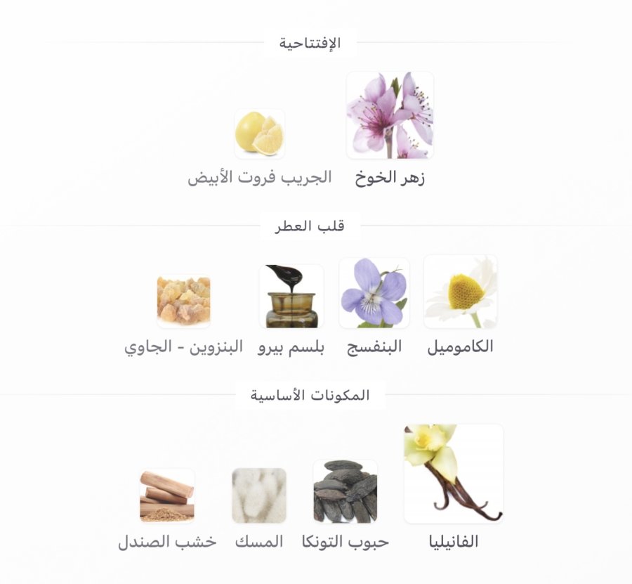 • القاعدة: الفانيليا 🍮، حبوب التونكا 🌱، المسك 🤍، خشب الصندل 🌳