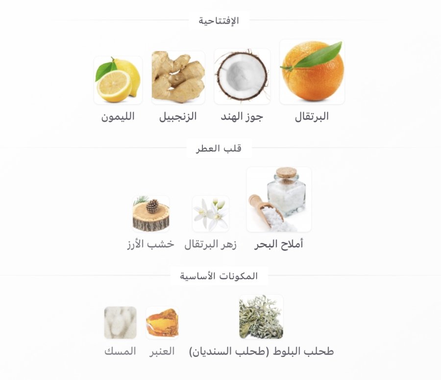 • القلب: ملح البحر 🌊، زهر البرتقال 🌼، خشب الأرز 🌲