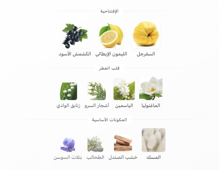• القاعدة: المسك 🤍، خشب الصندل 🌳، الطحالب 🌿، بتلات السوسن 🌸