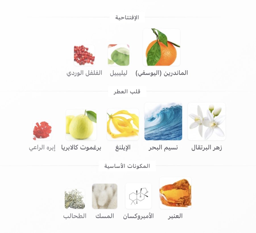 • القلب: زهرة البرتقال 🌼، نسمات بحرية 🌊، الإيلنغ يلانغ 🌺، البرغموت الكالابري 🍋، الجيرانيوم 🌿