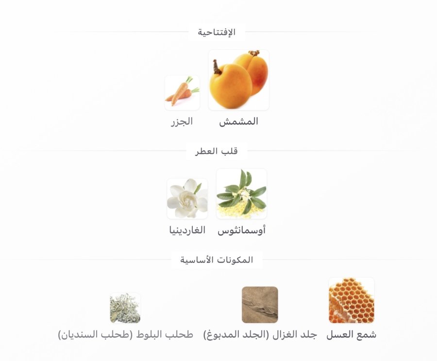 • القاعدة: شمع العسل 🍯، الجلد السويدي 🧥، طحلب السنديان 🌿