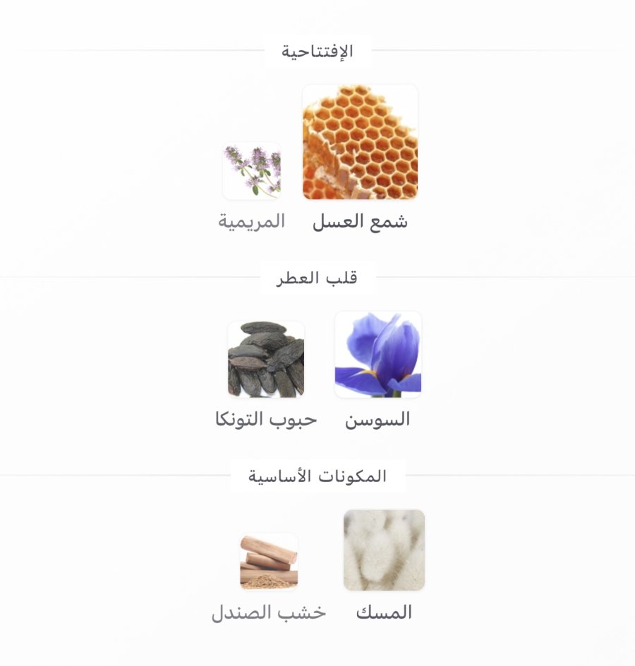 • القاعدة: المسك 🤍، خشب الصندل 🌳