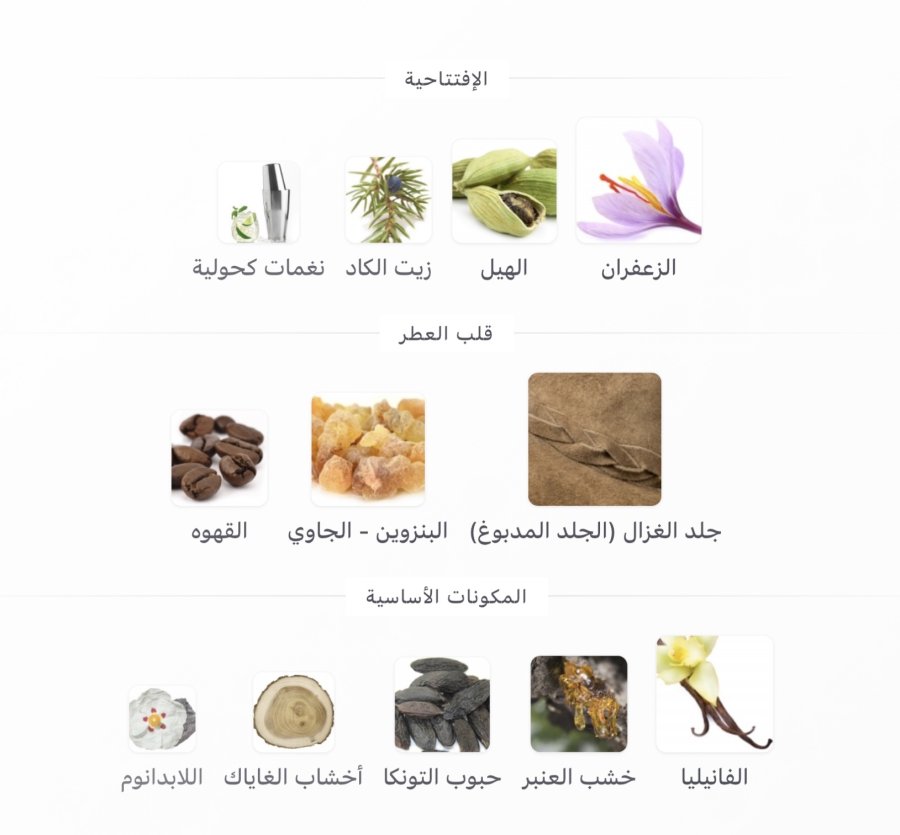 • المقدمة: الزعفران 🌾، الهيل 🌰، زيت الكادي 🌿، نوتات كحولية 🥃