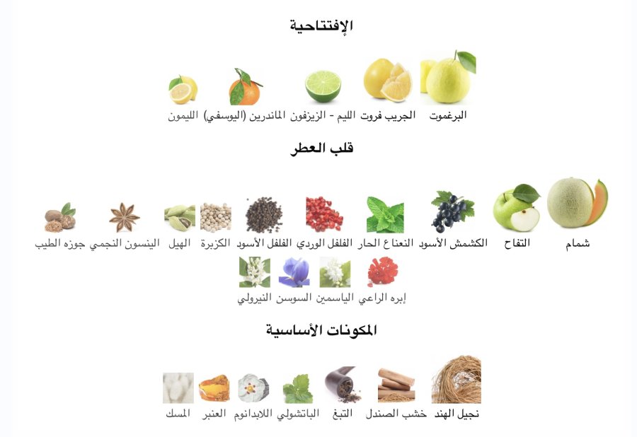 •القلب: الشمام 🍈، التفاح 🍏، الكشمش الأسود 🍇، النعناع 🍃، الفلفل الوردي 🌸، الفلفل الأسود 🌶️، الكزبرة 🌿، الهيل 🌱، اليانسون النجمي ⭐، جوزة الطيب 🌰، الغرنوقي 🌺، الياسمين 🌸، السوسن 🌼، زهر النيرولي 🌿