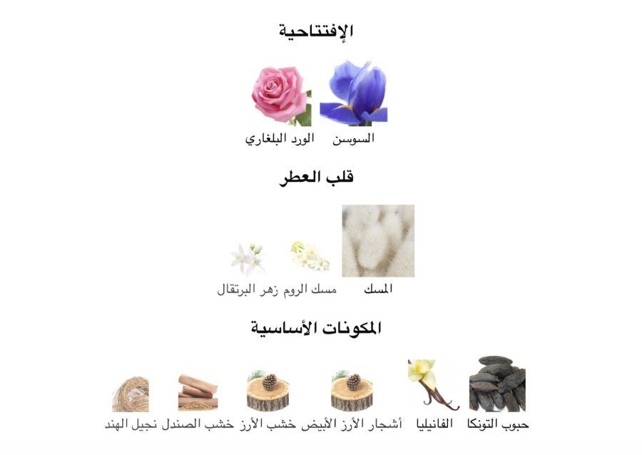 • القاعدة: حبوب التونكا 🌿، الفانيليا 🍦، خشب الأرز الأبيض 🌲، الصندل 🌳، نجيل الهند 🌱