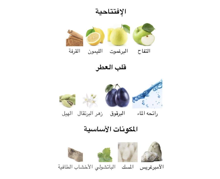 •القلب: نوتات مائية 💦، البرقوق 🍑، زهر البرتقال 🌼، الهيل 🌿