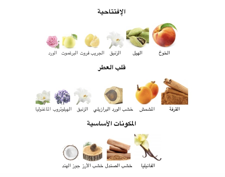 • المقدمة: الخوخ 🍑، الهيل 🌿، الزنبق 🌸، الجريب فروت 🍊، البرغموت 🍋، الورد 🌹