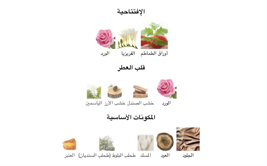 •القلب: الورد 🌹، خشب الصندل 🪵، خشب الأرز 🌲، الياسمين 🌼