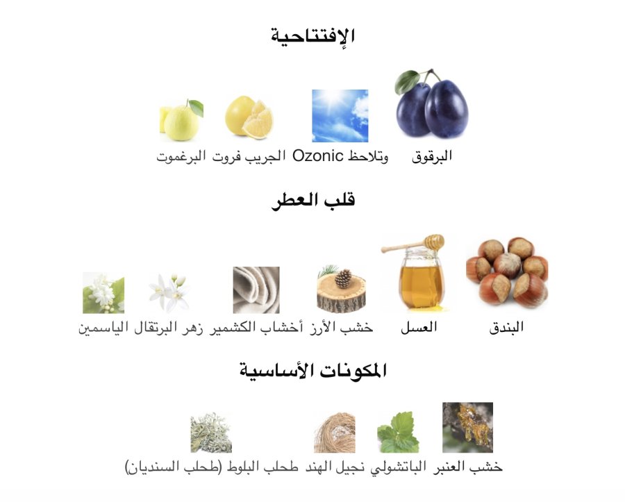 • القلب: البندق 🌰، العسل 🍯، الأرز 🌲، خشب الكشمير 🌳، زهر البرتقال 🍊🌸، الياسمين 🌼