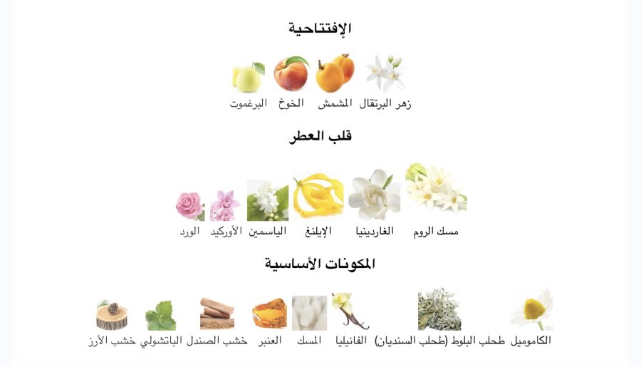 • القلب: مسك الروم 🌸، الغاردينيا 🌼، الإيلنغ-إيلنغ 🌺، الياسمين 🌸، الأوركيد 🌸، الورد 🌹