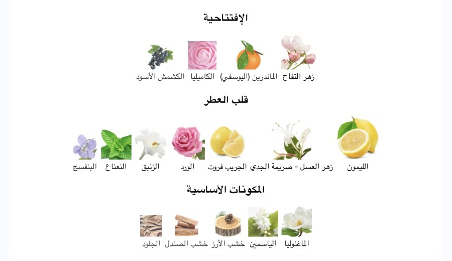 • القلب: الليمون 🍋، العسلية 🌼، الجريب فروت 🍊، الورد 🌹، الزنبق 🤍، النعناع 🍃، والبنفسج 💜
