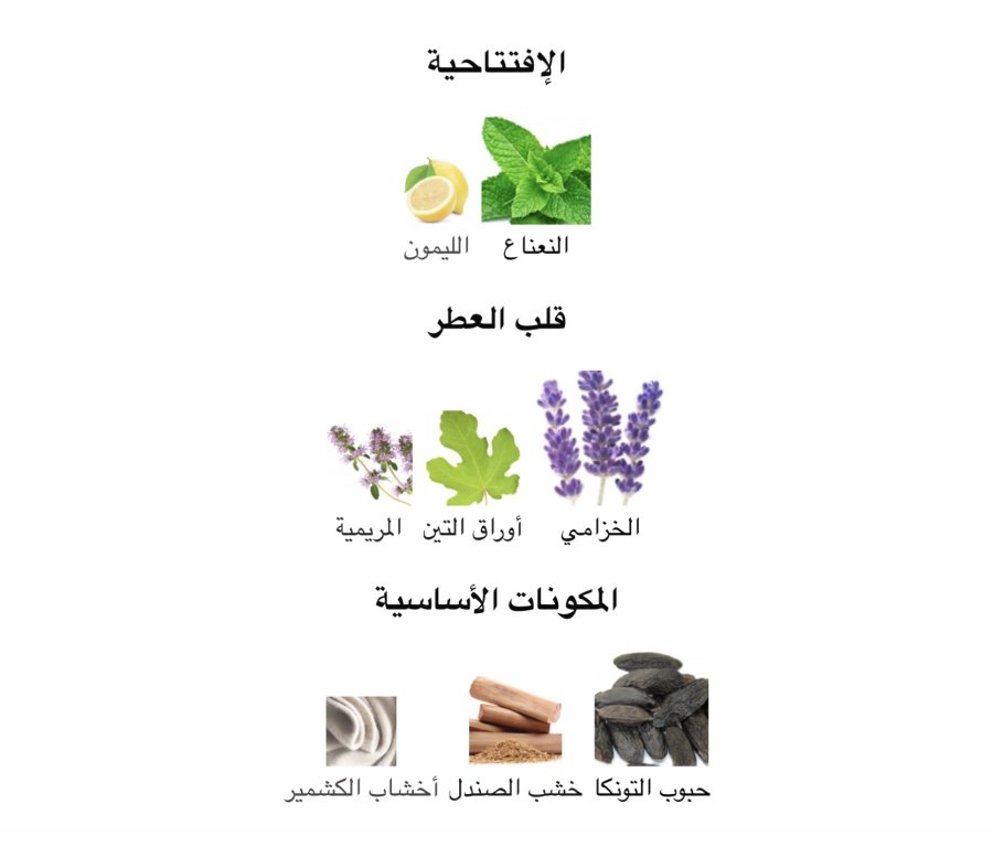 • القاعدة: حبوب التونكا 🌿، خشب الصندل 🌳، خشب الكشمير ✨
