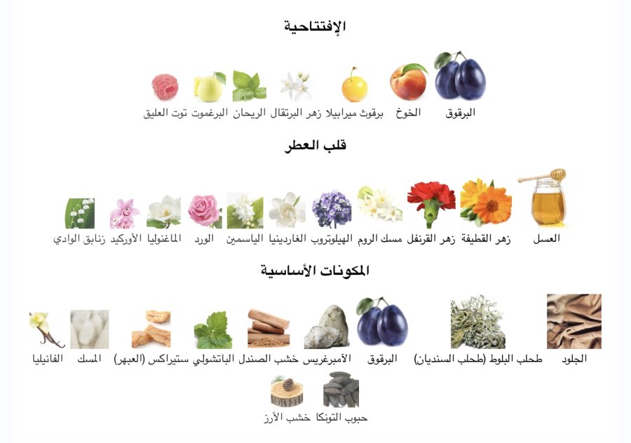 •القاعدة: الجلد 🤎، طحلب السنديان 🌿، البرقوق 🍑، العنبر الرمادي 🐚، خشب الصندل 🌳، الباتشولي 🌿، المسك 🤍، الستوراكس 🌲، الفانيليا 🍮، حبوب التونكا 🌰، خشب الأرز 🪵