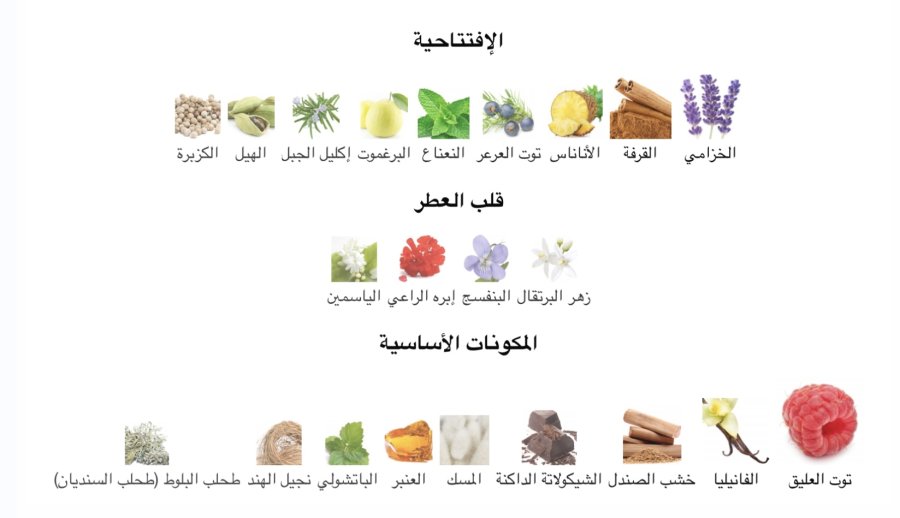 •القاعدة: التوت الأحمر 🍓، الفانيليا 🍦، خشب الصندل 🪵، الشوكولاتة الداكنة 🍫، المسك 🤍، العنبر، الباتشولي 🌿، نجيل الهند، طحلب البلوط 🌿